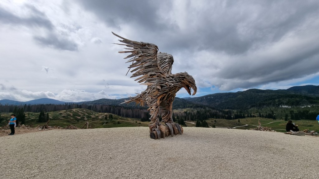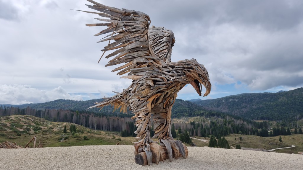 Panoramica del capolavoro del maestro Marco Martalar, alta 7 mt e larga 5 mt, si erge in una collina immersa nella piana di marcesina in localitá barricata in comune di Grigno (TN). Per realizzarla l’artista di Roana ha impiegato 1800 viti, 100 metri di tavole e murali in larice coperti con 1500 pezzi di radici e altro materiale raccolto nel raggio di un km. È stata creata per ricordare la tremenda catastrofe che ha abbattuto interi boschi sulla piana di Marcesina, poi luogo del più grande cantiere forestale d’Europa. L’ Aquila rappresenta la forza della natura che qui si è scatenata con enorme aggressività e potenza.